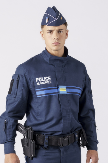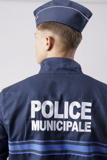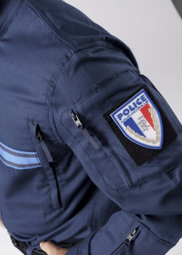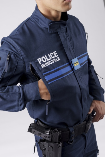 - Triple bande gitane stretch, supports auto-agrippants pour écussons et broderies “POLICE MUNICIPALE” devant et dos conformément à l’arrêté du 5 mai 2014.
